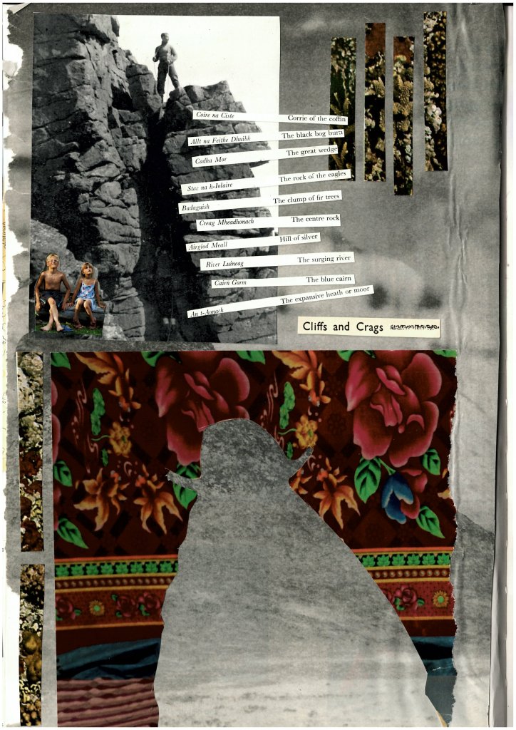 My poems for the journal – ‘Floating Curious’, ‘She wants you to glide’, and ‘Cliffs and Crags’ – are all ‘collage poems’, works of visual poetry that combine found text and imagery to create something new and surreal. I started creating collage poems during the pandemic, but it was really a research fellowship working with the scrapbooks of Edwin Morgan at the University of Glasgow Archives and Special Collections, that saw this method of poetic making flourish and develop.